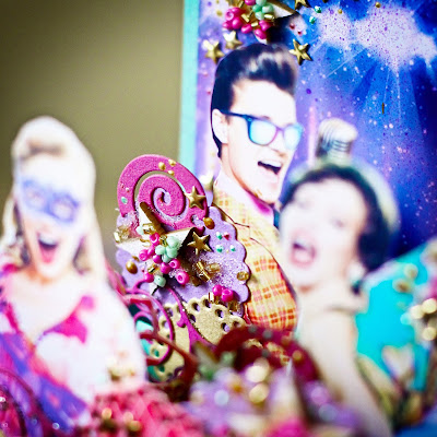 Смотрели яркий и красочный фильм "Стиляги"? ;-) Обожаю моду тех времен - яркие тона в одежде, пышные юбки чуть ниже колена, красная помада... Ну, а если вы хотите кому-то поднять настроение, то работа в стиле этого фильма самое то! :-) У меня сложилась вот такая Pop-up Box Card... Яркие и неповторимые герои фильма, сочная и красочная цветовая гамма, море бисера, звезд и блеска! Ну, и вдохновляющая надпись... :-) Вот: