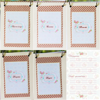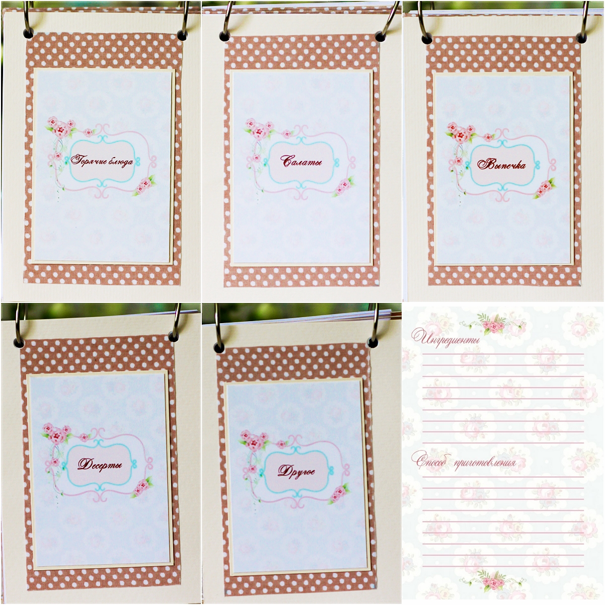 Книга настольная, перекидная. Эта книжечка в более нежном и воздушном стиле... :-) Формат 14,5х16 см. В книжечке 5 разделов, в каждом разделе по 7-8 двусторонних листиков для рецептов форматом 10х15 см. Т.е. всего получается 72 странички. Книга на разъемных кольцах, поэтому странички можно менять между собой и перемещать из раздела в раздел. А также можно добавлять какие-то вырезки, продырявив предварительно дырочки дыроколом. :-)