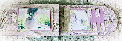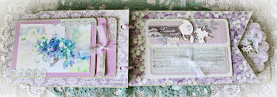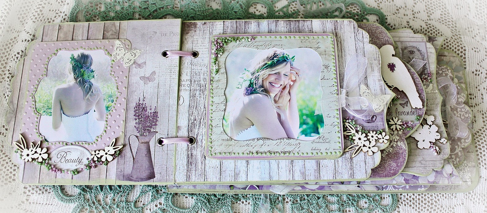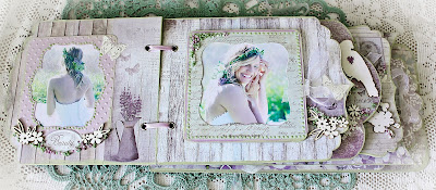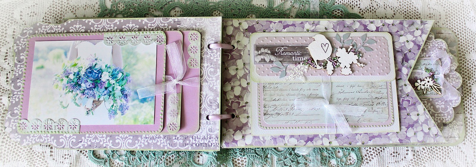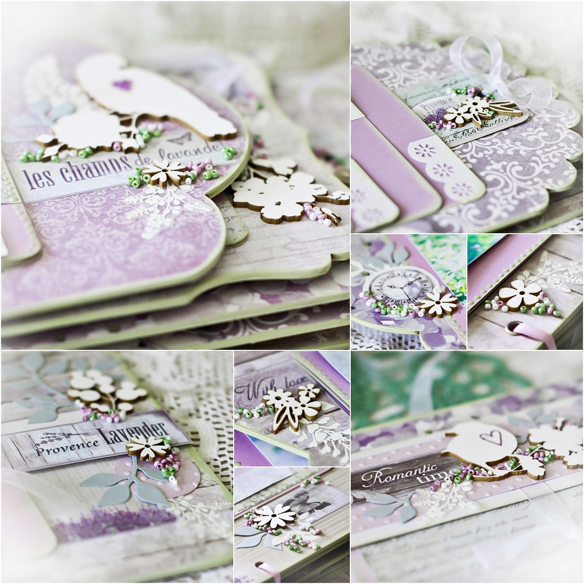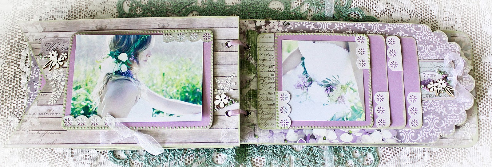 Ну, конечно же, по такой доске вдохновения обязательно должно было сотвориться что-то нежное и легкое... :-) И почему-то у меня все эти элементы ассоциируются со стилем а-ля-прованс. В итоге получился вот такой фотоальбом! Дощатый фон, серо-сиренево-зеленая цветовая гамма, россыпь чего-то блестящего и воздушного (у меня это бисер вместе с хрустальным топпингом), светлые цветочки... В общем - просто море нежности и воздушности!!! :-)