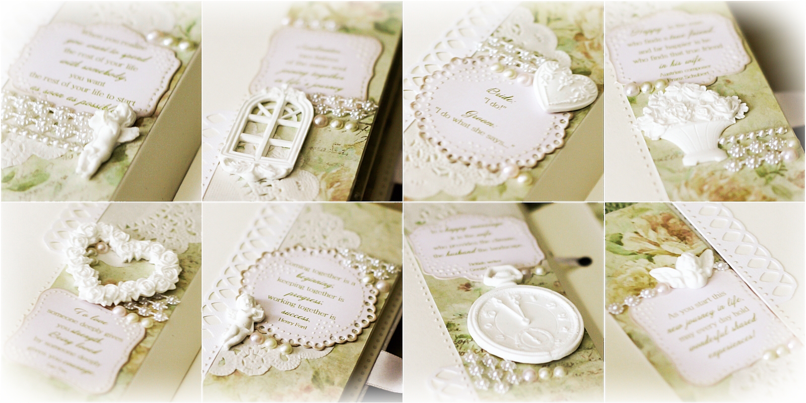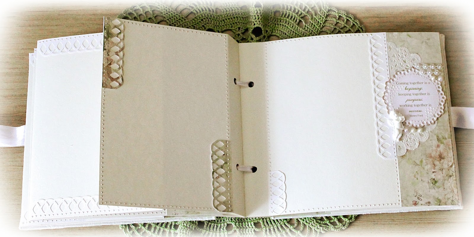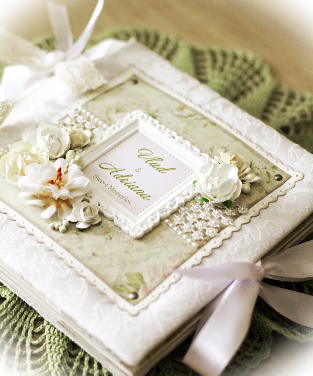 А сегодня я со свадебным фотоальбомом в жемчужно-оливковой цветовой гамме... :-) Его формат 16,5х19 см. На каждой страничке красивая фраза и место для фото 10х15 см. Всего вмещает в себя 24 фото.