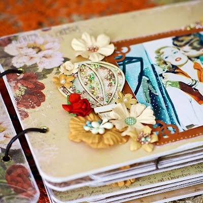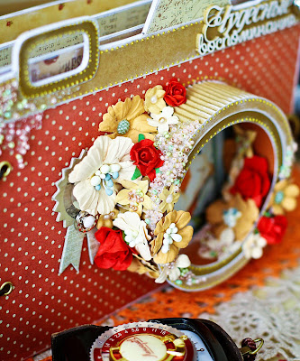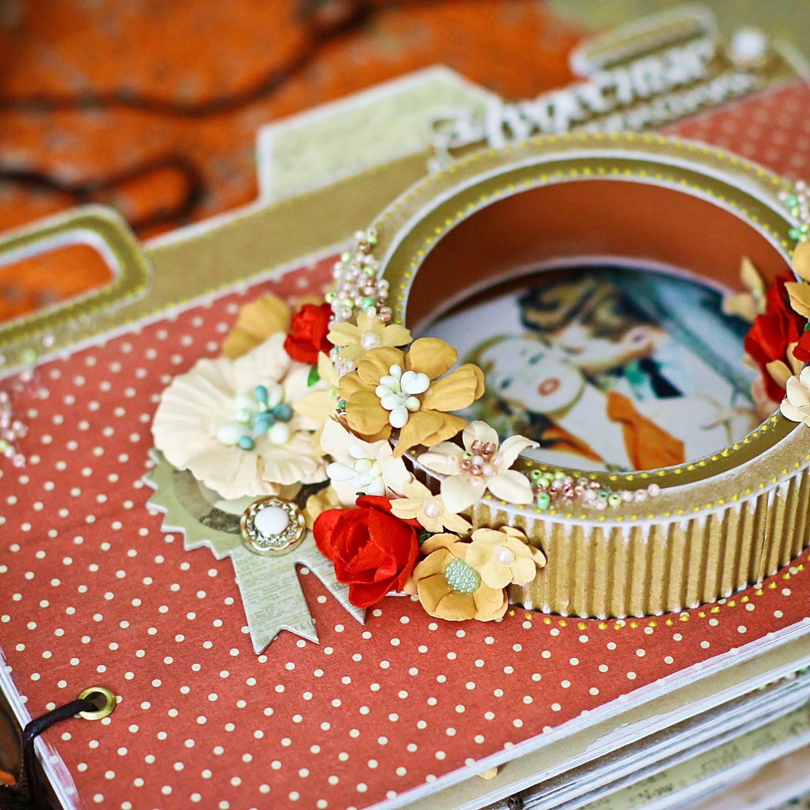 Наконец-то, я его сделала - альбом в форме фотоаппарата... Идея зрела очень давно, руки так и чесались... Когда начала его делать, задумка и концепция была совершенно другой. Сначала хотела сделать альбом-путешествий - с соответствующим тематическим чипбордом. И он обязательно должен был быть в стиле ретро и абсолютно без цветов... :-) Начала делать, подобрала подходящую под стиль бумагу, обклеила. А когда дело дошло до объектива, я поняла, что он обязательно должен быть выпуклым, как у настоящего фотоаппарата. Причем сначала хотела сделать его с пленкой - имитацией стекла. Но потом передумала, и сделала его пустым. И тут все пошло не по плану. Я поняла, что объектив внутри нужно чем-то заполнить! И не чем иным, как цветами! А какими цветами? Если учесть, что их должно быть много, а готовых у меня выбор не велик, то конечно же, цветами ручной работы! Ну, а раз весь объектив будет усеян цветами, то альбом тоже! А как иначе? В итоге наделала море цветов, абсолютно разных размеров и форм. Абсолютно все цветы, кроме красных розочек, мои! В этом еще одна прелесть этого альбома! :-)