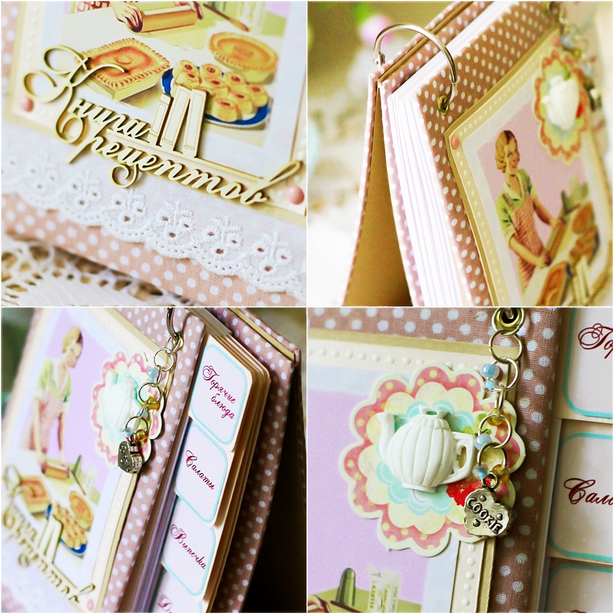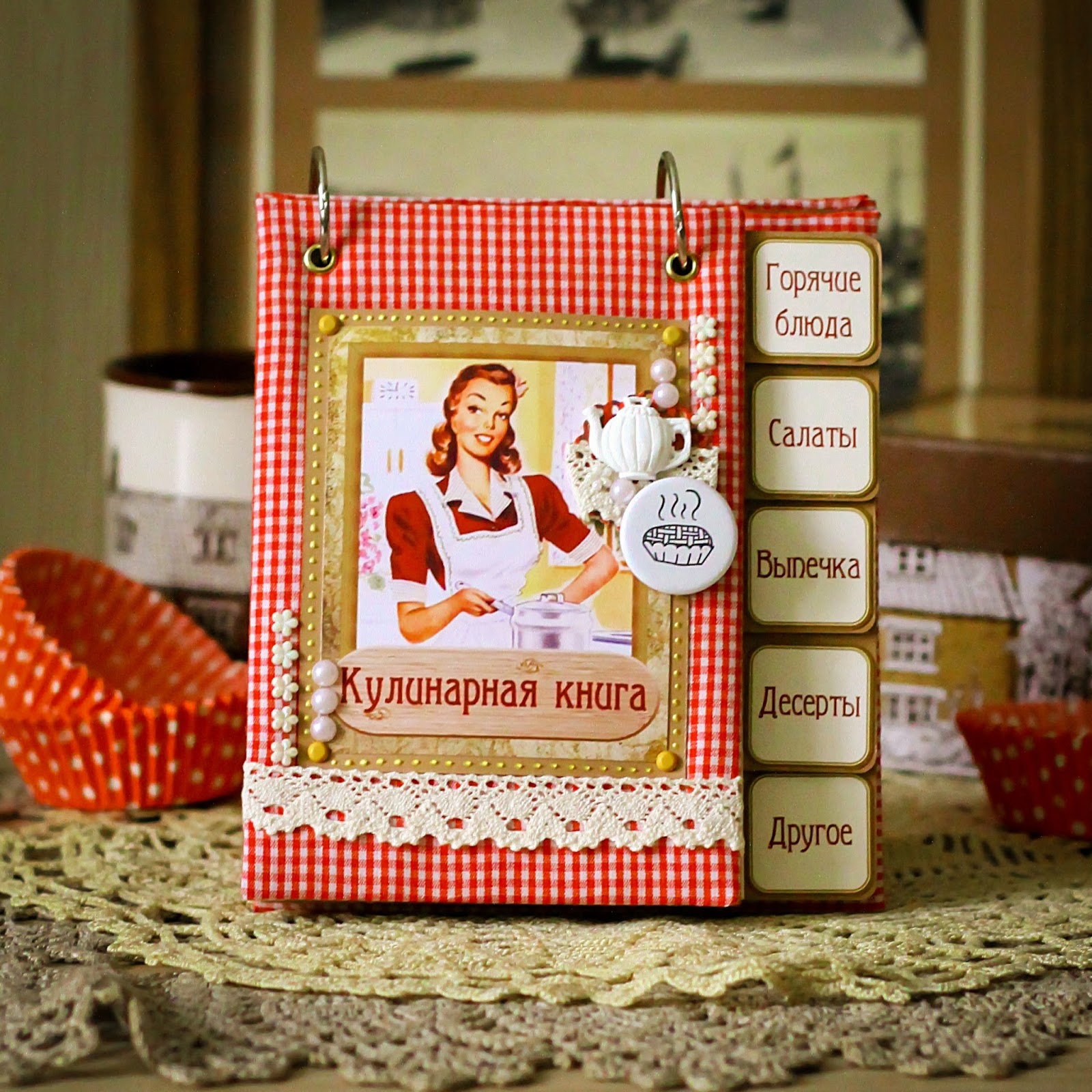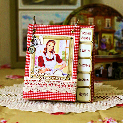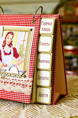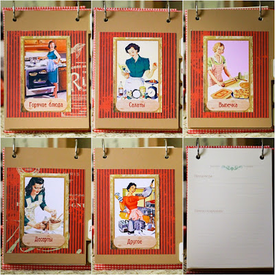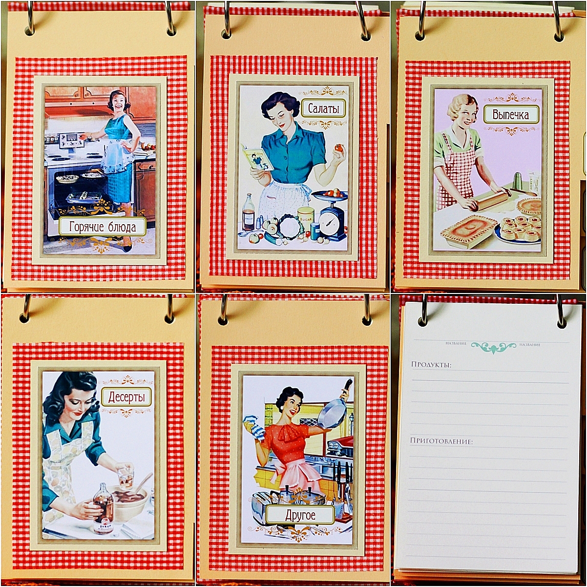 Книга настольная, перекидная. Каждый ее раздел украшают красивые ретро-девушки... :-) Формат 14,5х16 см. В книжечке 5 разделов, в каждом разделе по 7-8 двусторонних листиков для рецептов форматом 10х15 см. Т.е. всего получается 72 странички. Книга на разъемных кольцах, поэтому странички можно менять между собой и перемещать из раздела в раздел. А также можно добавлять какие-то вырезки, продырявив предварительно дырочки дыроколом. :-)
