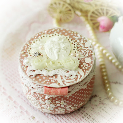 Вот такая шкатулочка у меня получилась... Основа - бобина от скотча. Давненько я не делала их... :-) Вся шкатулка обтянута тканью, внутри тоже ткань. А в качестве декора - текстурная паста, жидкий жемчуг, жемчужный спрей, камея, кружево и другие элементы декора... Края тонировала белой акриловой краской... Вот, глядите... :-)