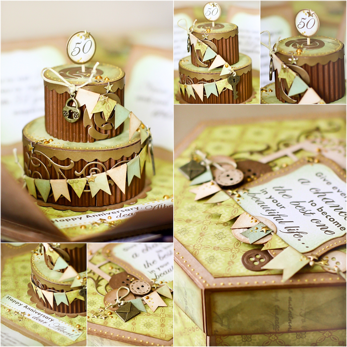 Крышка открывается... боковые стенки распадаются... и нашему взору предстает тортик! Самый настоящий, очень праздничный и мужской. Ну, а по бокам - тройные стенки с красивыми надписями и фото...