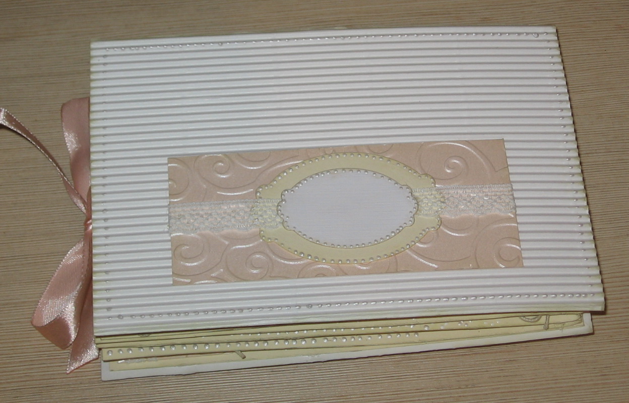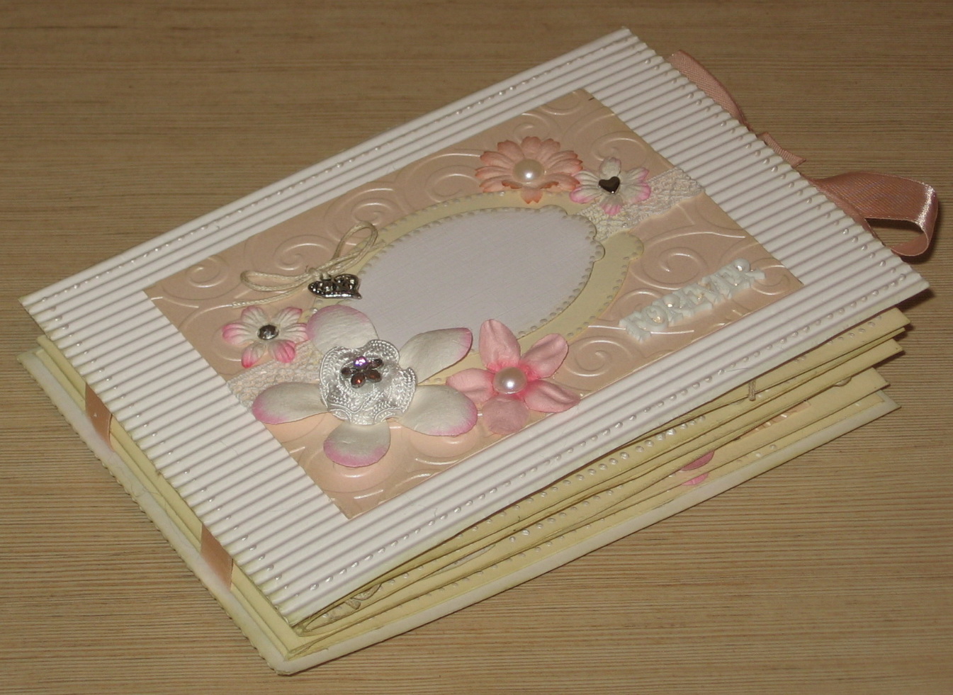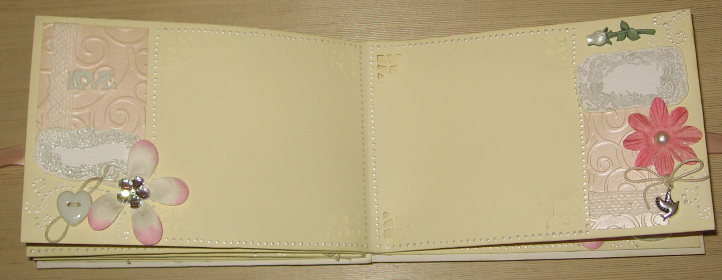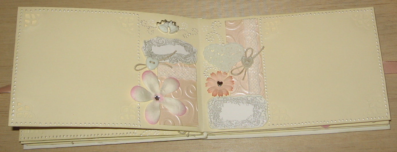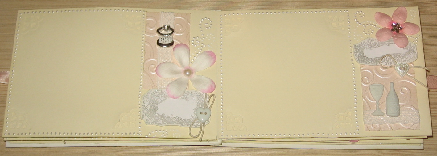 Давно у меня лежали пуговки на свадебную тематику… И давно я мечтала сделать фотоальбом с их использованием… И вот, наконец, нашлось на него время! Получился вот такой фотоальбомчик на 12 фотографий размером 10х10 см. Есть места для записей на каждой страничке. Они сделаны при помощи горячего эмбоссинга – примовские штампы, платиновые чернила и бесцветная пудра. Фото вставляются в ажурные уголки. Кстати тут я использовала свою новую папочку для тиснения. Именно она и вдохновила меня сделать что-то такое нежное и воздушное…На обложке можно написать имена молодожен: