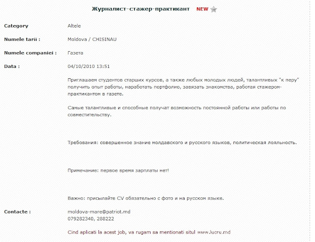 Moldovenii ăștia îs patrioți astăzi peste tot, în oficii, în Parlament, în Guvern, pe Albișoara, în guri de canal, pe internet, unde dorești, numai nu în inimă. Profanând și profitând de mărețul nume al voevodului Ștefan cel Mare, niște mârșavi ocupanți, necărturari, needucați, cu spume la gură, astăzi vin ca să ne închidă la toți gura, căci doar ei îs patrioții Moldovei. Bunăoară niște handicapați căzuți din pod (altfel n-am cum să-i insult) se înscriu în cursa electorală ce urmează cu un grandios și zguduitor nume de partid - Patrioții Moldovei ! Mi-aș înghiți limba și m-aș îneca în propria salivă dacă ăștia ar fi patrioți, dar cum pot fi dânșii astfel cînd calcă în picioare scumpa limbă română, pentru care au fost măcelăriți și deportați în iad sute și mii de moldoveni. Partidul ăsta Patrioții Moldovei a dat recent un anunț pe internet, unde caută să angajeze o jurnalistă, pentru propriile interese meschine. Dureros e faptul că sub denumirea de patrioți și cu un dur nume de email: moldova-mare, dânșii cer (în rusă) ca CV-ul potețialului angajat să fie obligatoriu în limba rusă. Păi și atunci ce fel de patriot ești tu ? Al cui, pentru cine, sub cine, pentru ce? Știu că nu vor ajunge niciodată nici măcar în Parlament, însă rămâne dureros faptul că niște cretini își bat joc de istorie, de Moldova, de Ștefan cel Mare și de multosândita limbă română. aici puteți analiza site-ul pretinșilor patrioți: http://patriot.md/ Sursa 2010-10-06 23:02:28