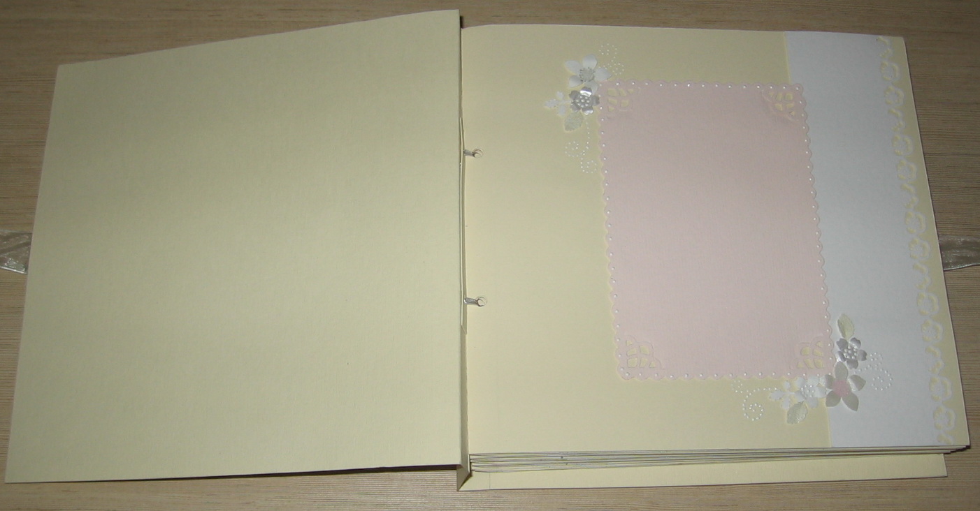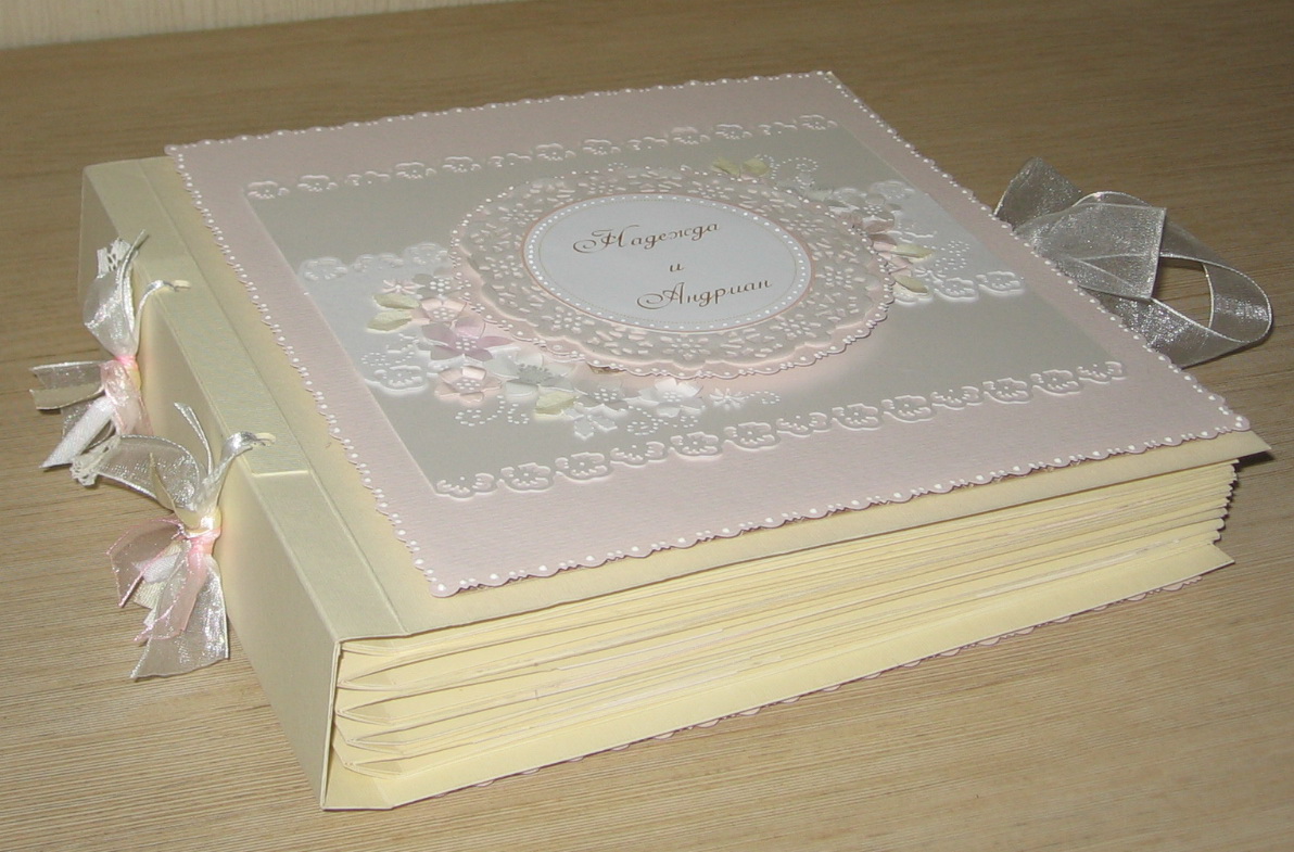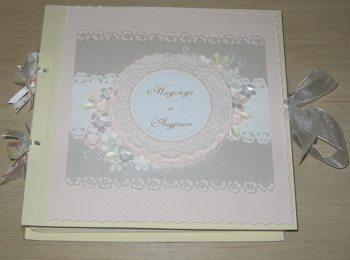 Наконец-то, я это сделала! Это свадебная книга пожеланий! Это, пожалуй, самый масштабные проект этого года… Даже масштабнее проектов с пригласительными… Кроме того, это и самая необычная моя работа.. Масштабность ее в том, что в ней 30 листов, причем не просто листов: левая часть каждого разворота – это оформленная страничка с рамкой под фото 10х15 см, а правая часть разворота – пустая страница для пожеланий. Таких оформленных страниц 30! Причем формат книги 23х23 см. А необычность этой работы в том, что она сделала полностью из картона и бумаги! Нет ни кружев, ни покупных цветов, ни брадз, ни всяких других украшений. Все элементы декора сделаны при помощи дыроколов. Именно это и сподвигло меня прикупить пару дыроколов от Марты Стюарт – Бордюрный дырокол "Цветы" и дырокол "Цветочек" со штампами. Просто не нарадуюсь им!!! И именно благодаря тому, что все элементы декора сделаны в одной цветовой гамме, и сделало книгу настолько гармоничной и нежной… Если честно, вначале я с опаской бралась за эту работу, но результатом я довольна на все 100%! Только в обложке я позволила себе использовать ленты, кружева и ажурные салфетки. Вот сама обложка: