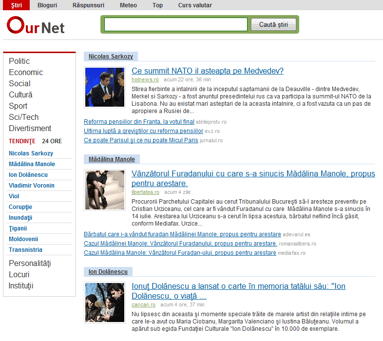 În imaginea de ma sus putem vedea cele mai importante 3 subiecte de azi: Nicolas Sarkozy (summitul NATO), Mădălina Manole (vânzătorul Furadanului) şi Ion Dolănescu (lansarea cărţii).Acesta este cea mai importantă funcţie a proiectului la moment, dar desigur oferă şi multe alte facilităţi.