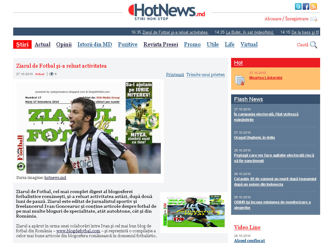 Portalul de ştiri hotnews.md a publicat ştirea despre revenirea Ziarului de Fotbal. Este vorba despre o informaţie postată acum cîteva minute, în care se pomeneşte despre înfiinţătorii Ziarului dar şi despre contentul pe care-l puteţi găsi acolo.