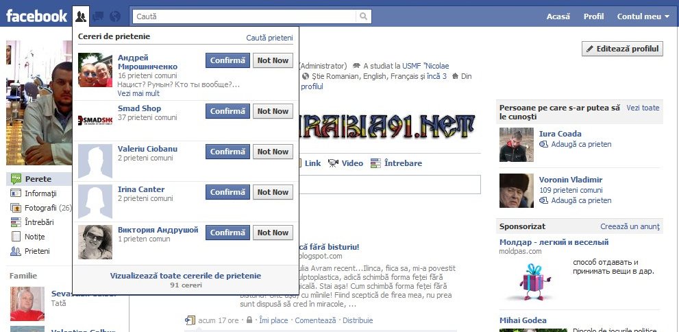 Facebook. 02.06.2011. Un oarecare comunist Андрей Мирошниченко (patriot al rodinei sale) îmi dă cerere de prietenie pe facebook. Dar (!), nu una simplă, ci una însoțită de un mesaj profund, gândit mai bine de 200 de ani de ocupație. Am rămas flatat de calificativile aduse.Să nu uit, mesajul: "Нацист? Румын? Кто ты вообще?" [trad.ro. nazist? român? cine ești în general?]