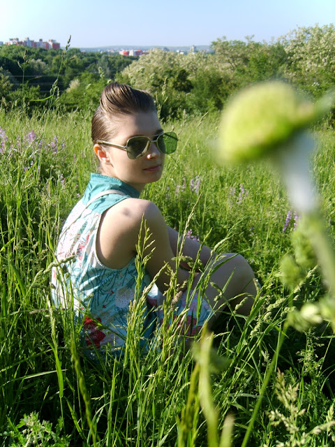 I like hot weather, but unfortunately I have to pass my exams, in order to write more often. This marvelous dress I bought some time ago in Kiev, but it remains one of my favorite ones. I like it all starting with print and color palette and finishing with tailoring. In this look I combine it with a white bag and flats, also with glasses with blue lens, a wristband and a bracelet of seashells. The wristband was brought me from Africa, but the bracelet I got from Crimea.