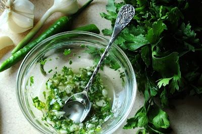 4. Муждей – это соус, оригинальный рецепт: надо растереть чеснок с солью и мясным бульоном, но я опять сделала по-другому. Мелко нарезала чеснок, острый перец и петрушку, добавила соль и подсолнечное масло вместо бульона. Этим соусом надо поливать мясо, но я им все могу поливать))), ну кроме сладостей конечно)))