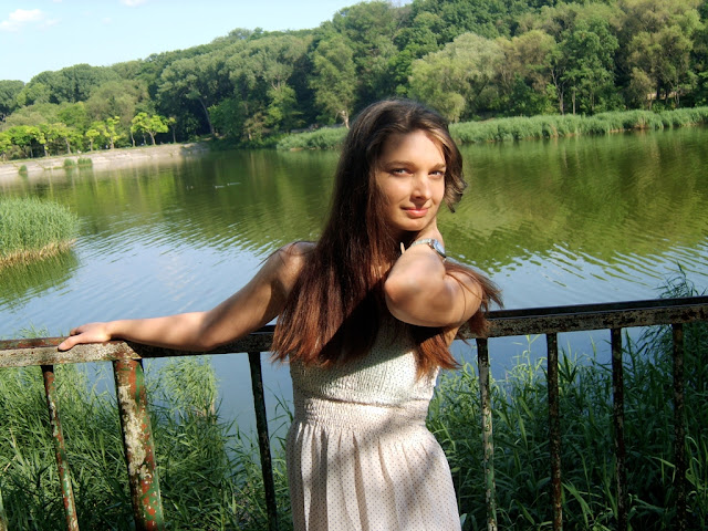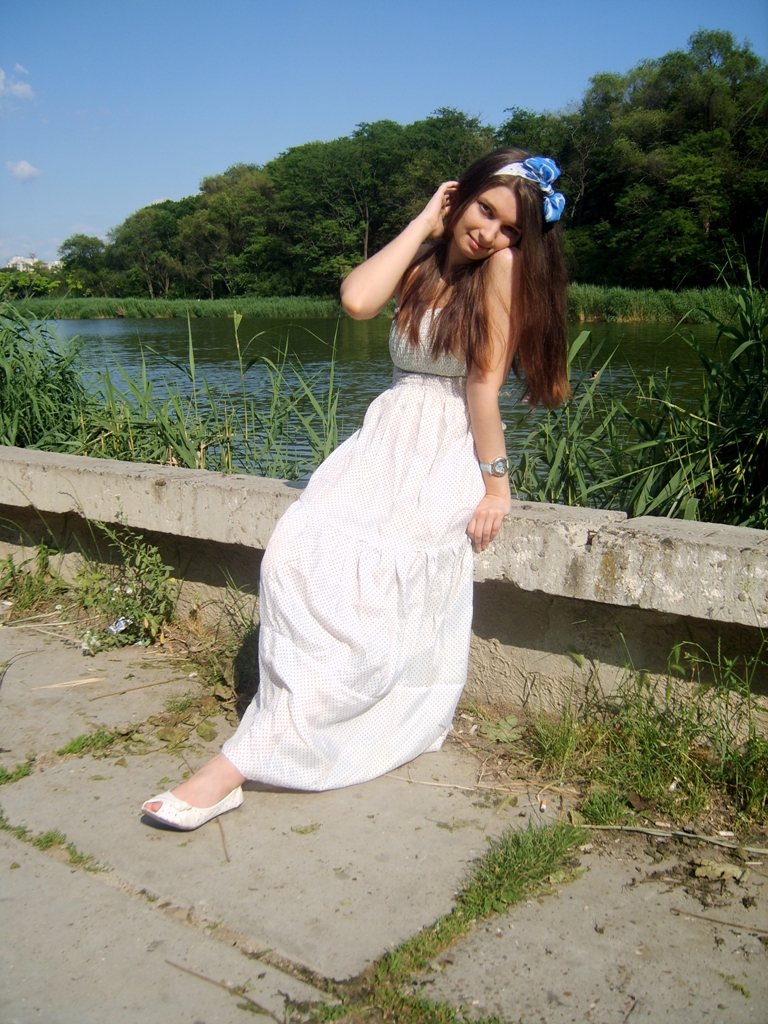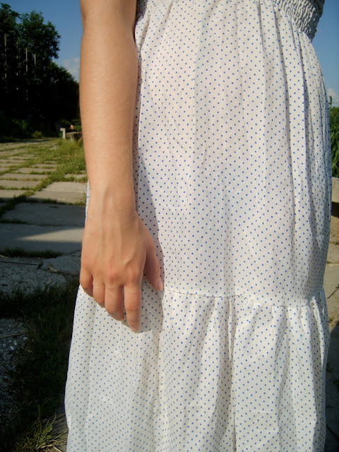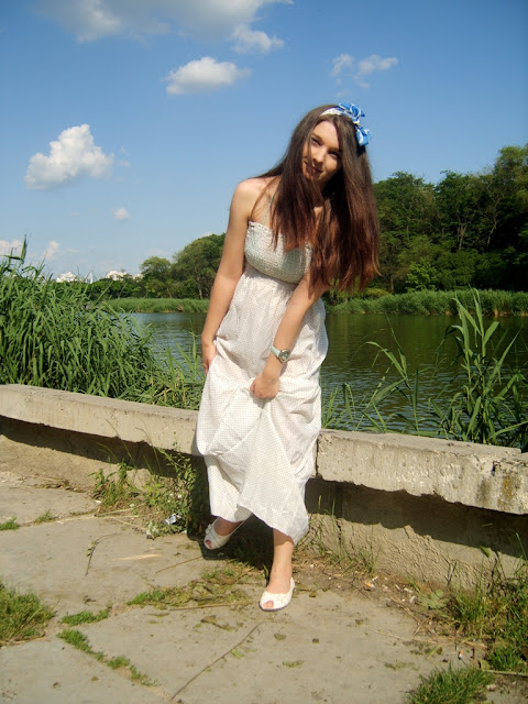 Weather is great and I have a very good mood to go for a refreshing walk to the pond. Even if I still have practical classes at college, it's more a plus than a minus, because I'll be able to sew myself something interesting (which I started to do). Soon I'll show you one of my new creations. And now, I want to introduce the completely simple summer dress for a hike to the pool or beach. Small dots on the dress have a support in a bow on the head. Although the composition is based on two colors (white and blue), the image turned out quite dynamic, due to ruffle print. Although the image is not complicate it attracts attention, but at the same time does not irritate the eye.