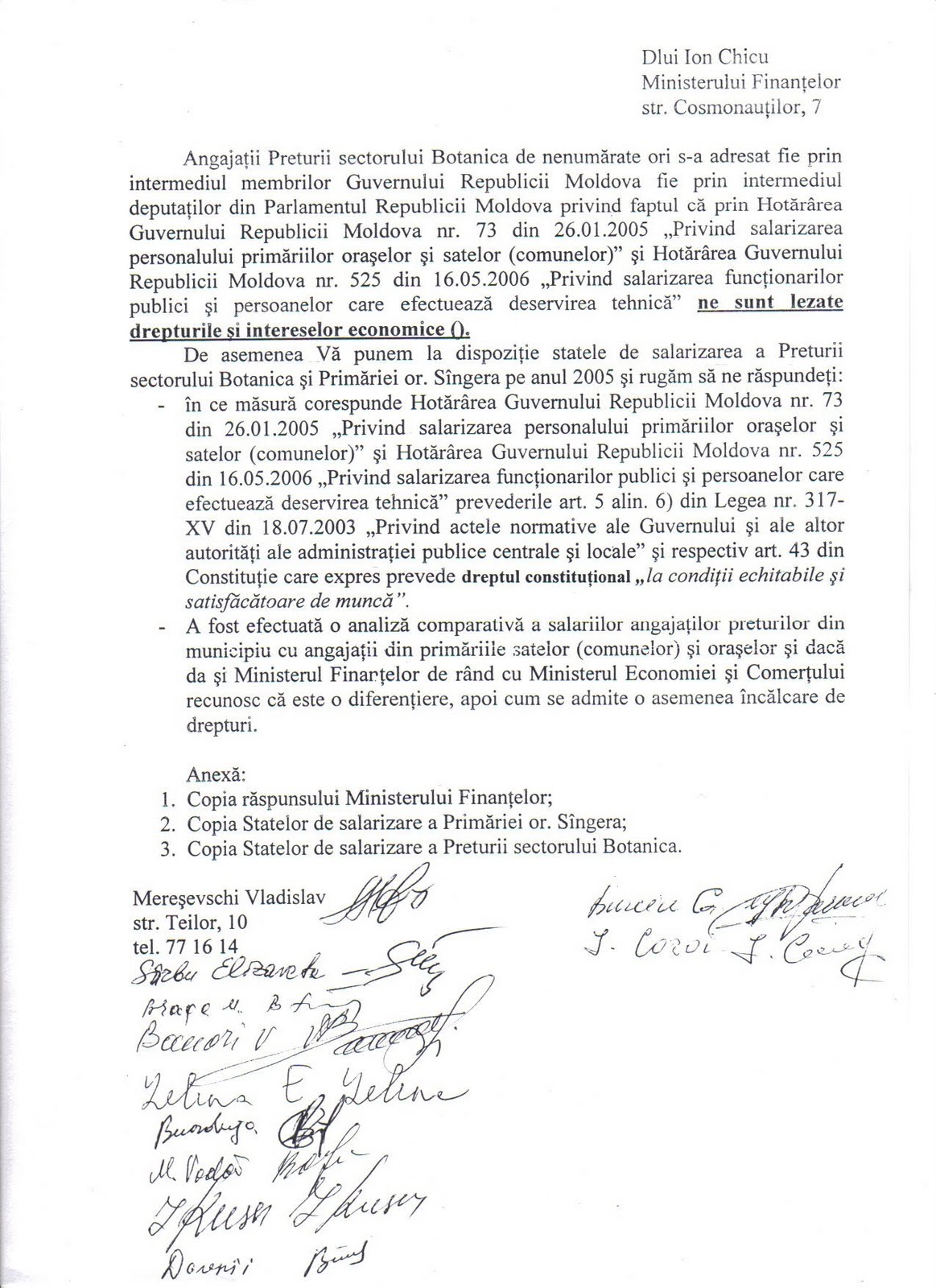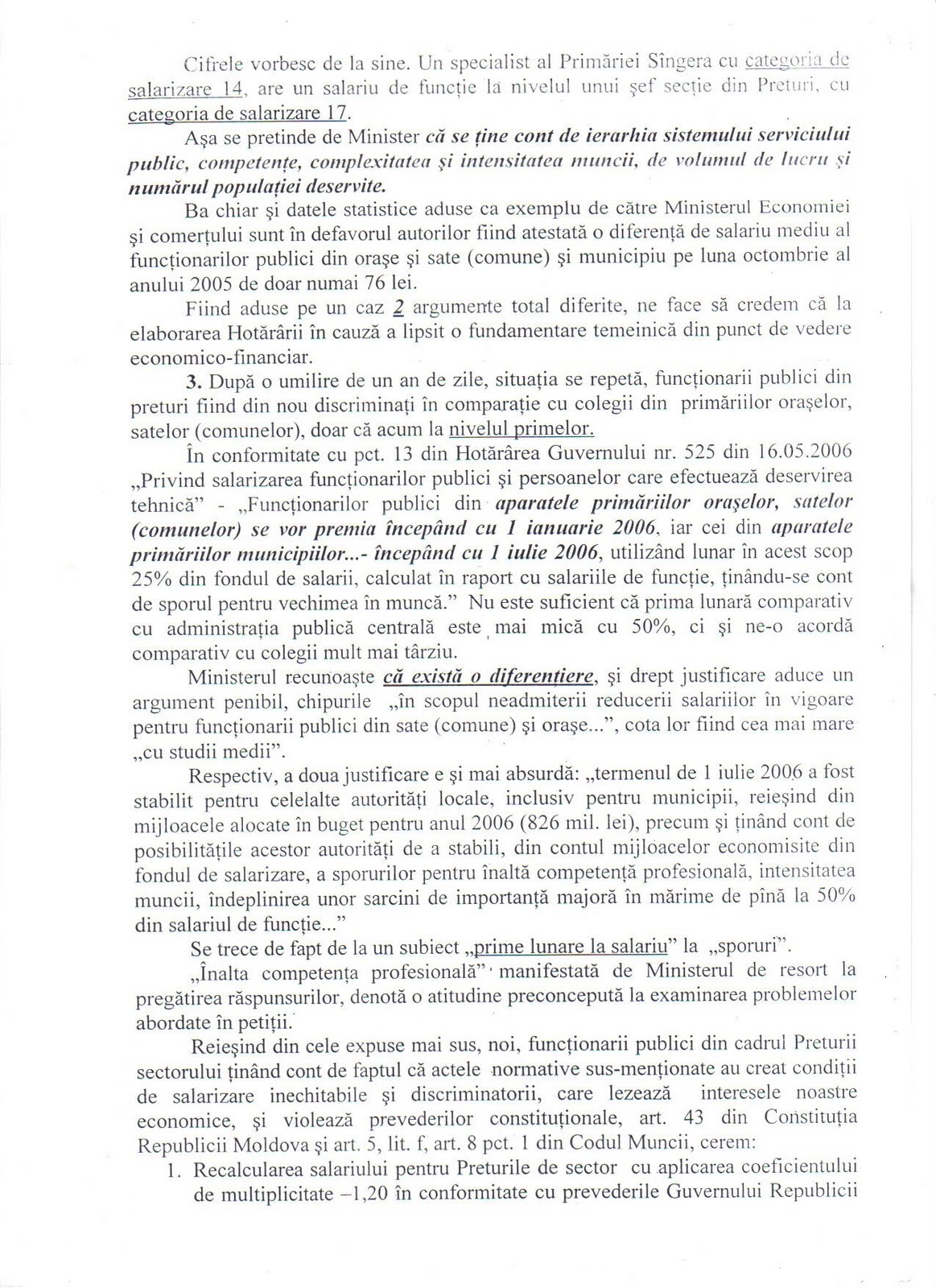 Am alcătuit o petiţie (naivul de mine) pe care am semnato, fiind semnată de colegii mei de serviciu. Şi de aici începe epopeea. La diferite întălniri cu membrii Guvernului fiind înmânată se pierde, dispare fără urmă. În final am fost nevoit să o trimitem prin poştă: Parlamentului RM, Sindicatelor de ramură şi Confederaţiei sindicatelor, Ministerului Economiei, Ministerului Finanţelor, Centrului pentru Drepturile Omului din Moldova.