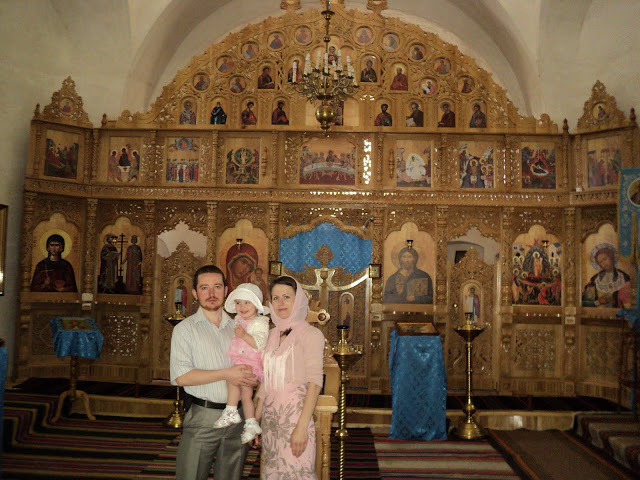 La mănăstirea Călărăşeuca (05.2011). Fotografie făcută în biserica "Acoperământul Maicii Domnului" pe fonul la noul iconostas în stil bizantin.