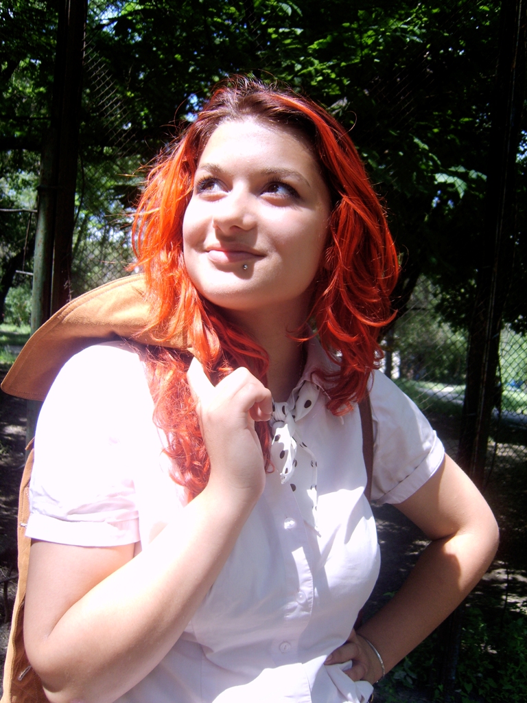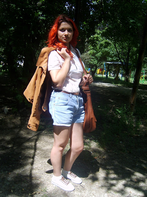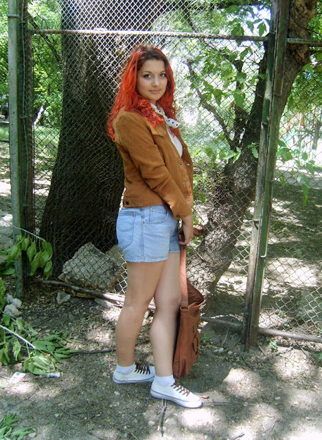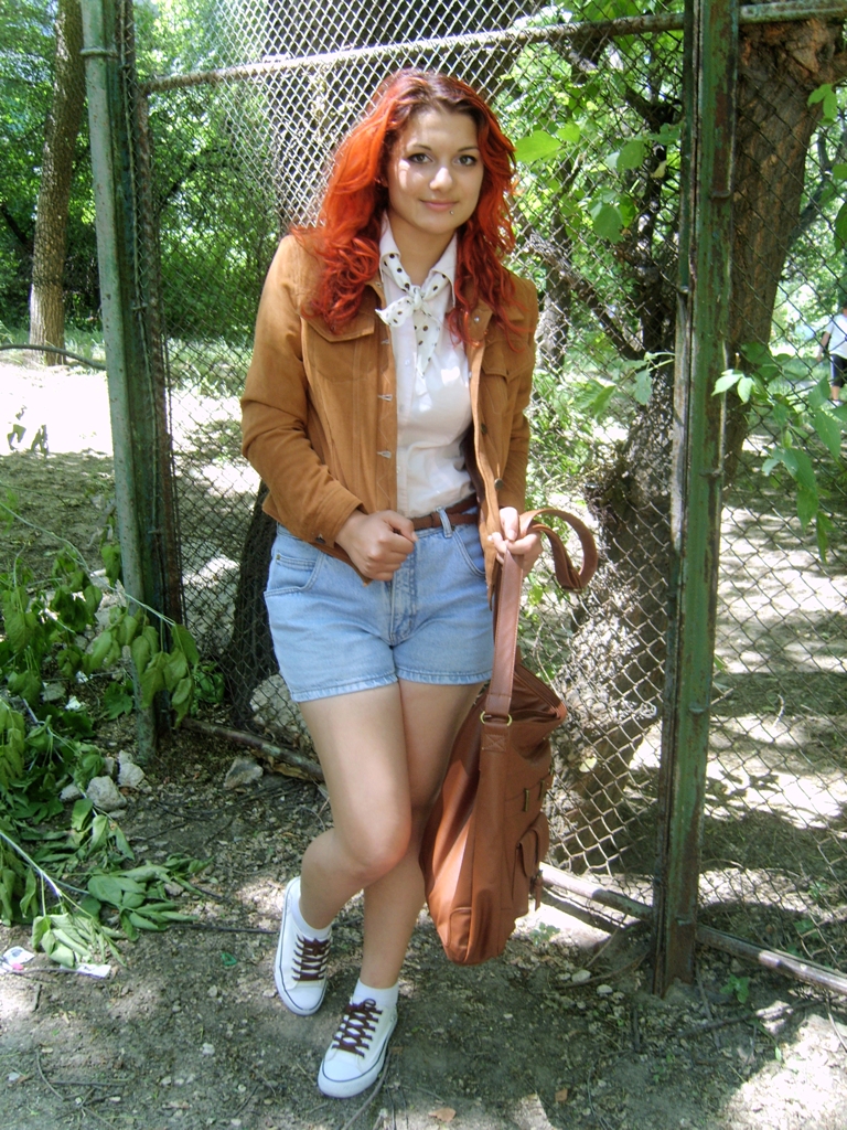 If some time ago we had prayed tirelessly for the heat, then now the weather turns into a hell-fire. The look of my friend Sasha reminds me about a cowboy in a contemporary vision. Brown suede jacket, shorts made of a hard denim and a scarf tied under the collar displays the details of this classic style, and the thin monotonous shirt and sneakers are giving this look a youth note. This image is remarkably complemented by accessories such as belt and brown bag, bringing the composition into a coherent whole, and the bright red hair gives it the flame.