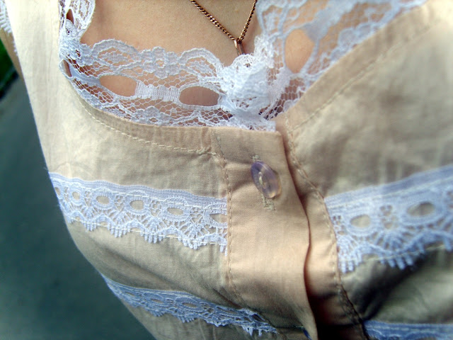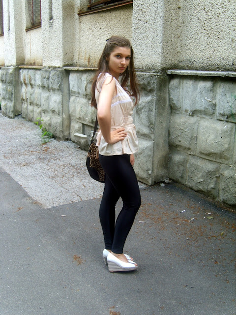 This image is a mix of two styles: Vintage and Urban. Flesh-colored blouse, with lace inserts is easily combined with black leggings, thereby creating a contrast that is not distracting from the lightness and airiness of the look, without straining the viewer's eye and not overloading the composition. Bag with leopard print is an accent, but at the same time it doesn’t stand out from the main color of the outfit, that way combining the composition into the whole.