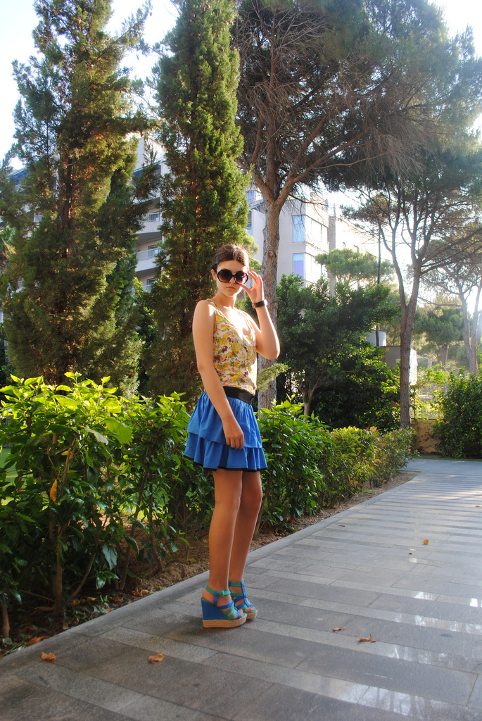 So it is fresh look in my electric blue skirt, t-shirt with fruits and colorful wedges. My new Tiffany's key, i love this colour.