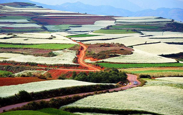În sudul Chinei, în provincia Yunnan , la graniţa acestei ţări cu Vietnamul, se află un loc cum puţini şi-ar putea imagina că există. Pare rupt din poveşti sau, mai degrabă, din pânzele unui pictor îndrăgostit de prea multe culori, un fenomen unic pe Terra de care localnicii şi oficialii de la Beijing nici nu par să fie conştienţi, dovada fiind faptul că zona nu a fost inclusă în circuitele turistice iar oamenii îşi duc viaţa liniştită la fel ca acum cel puţin un secol….Concentraţia mare de minereuri feroase, care datorită unei lungi perioade de oxidare au dat reliefului o neobişnuită culoare, este combinataă cu sutele de culturi ale ţăranilor chinezi. Aici nicio parcelă nu este necultivată, aşa caă, sute de culorii vii întregesc peisajul mirific.