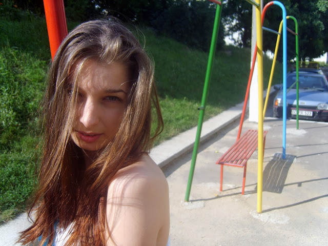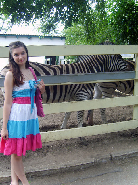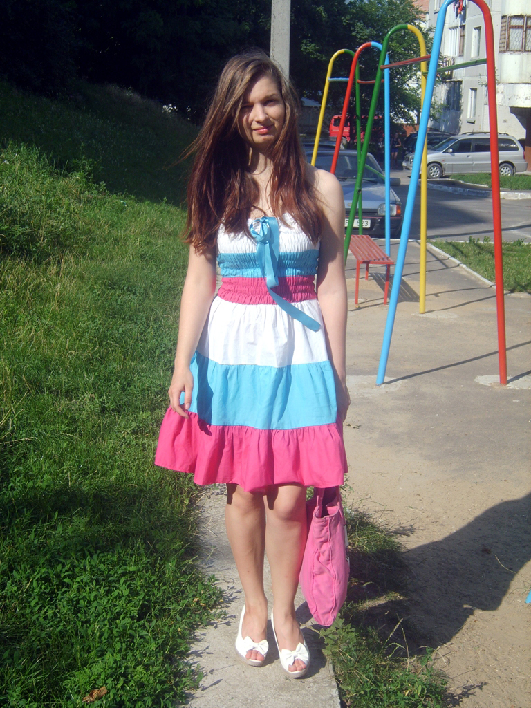 Today I want to show you a look, which is very simple, but I really like it. Because on the streets is an unbearable heat, I have no desire to wear layered clothing. This nice summer dress I bought in Odessa, in one of the local shops. Although it is not from a famous designer, I think it's great for summer time. Due to the bright color strips of cloth, which at the top of the dress are processed with rubber band, thereby creating a relief and on the skirt are stitched in the form of the sun, they create an original silhouette.