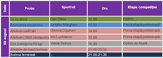 Intreg orarul transmisiunilor il vedeti in tabelIn ziua de 3 august va voi informa despre sportivii moldoveni la JO din Londra. Arena Olimpica de la Londra isi deschide vineri, 3 august, portile pentru competitiile de atletism. Iar arcasii intra in ultima faza a competitiei. Urmareste in DIRECT duelurile sportivilor moldoveni la Londra 2012.Primul care evolueaza este micul erou, Dan Olaru. Rind pe rind vor intra in competitie si atletii Olesea Cojuhari, Serghei Marghiev, Ion Luchianov.In ring la faza optimilor de finala intra si boxerul Vasile Belous.
