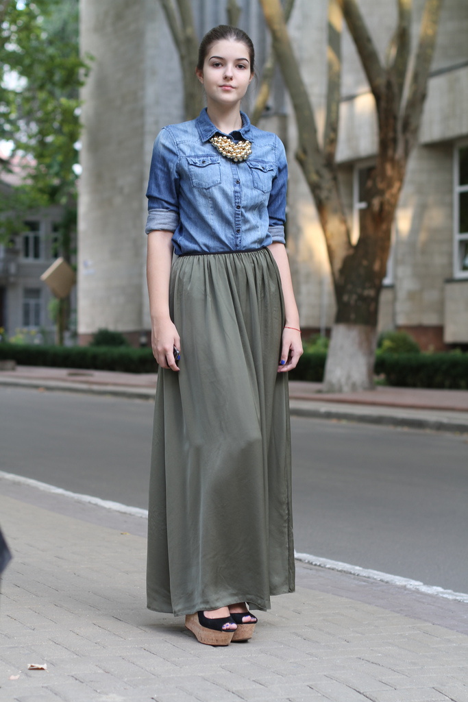 So I spent the day well. Weather I do not like, but by the evening gets better.I rarely wear maxi skirts, but I bought a one skirt. It has a beautiful color, which in my opinion looks great with denim, for example with a denim shirt or jacket. I decided to add a beautiful gold necklace, and black wedges. Stay tuned.With love, your Diana.