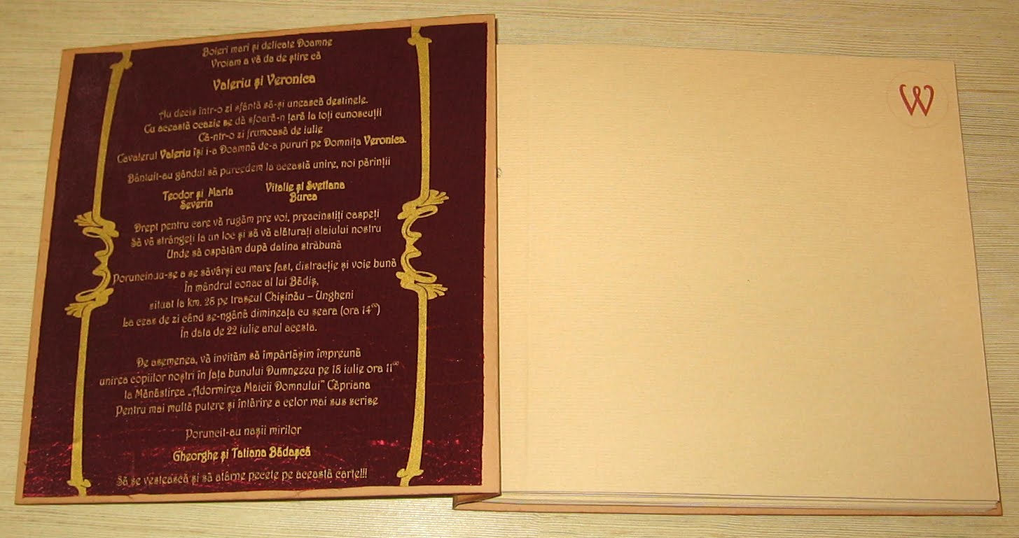 Свадебная книга пожеланий в средневековом стиле. На книге – фото жениха и невесты с венчания, у них даже наряд под стать тематике свадьбы… :-) Сама книга сделана под их пригласительные, в ней даже использованы элементы одного. Жаль, забыла сфоткать пригласительное, которое я использовала (делала их не я). Золотой картон с бордовым цветочным рисунком, золотые ленты, вензель на сургуче, текст на бордовой ткани внутри – это все элементы пригласительного.Формат книги 20х20 см. В ней 30 листов, сделанных из плотного бежевого картона. На каждой страничке – вензель жениха и невесты. На мой взгляд, получилось просто шикарно… :-)