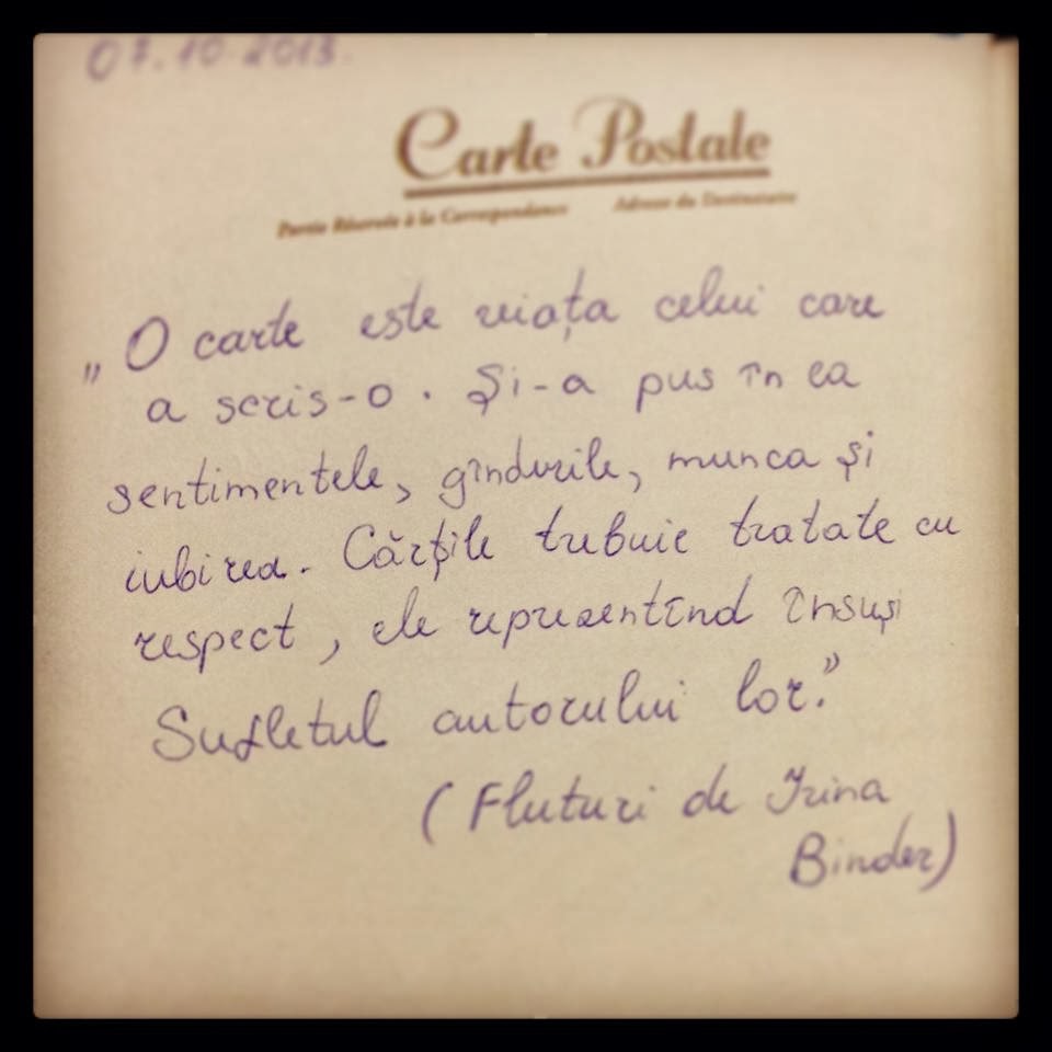 Am mîncat zi de zi ca o flămîndă din cele mai delicioase deserturi ale vieții mele - cărțile "Fluturi" . Îți mulțumesc că exiști Irina Binder! Am selectat cîteva fraze care mi-au rămas instantaneu în cuget :